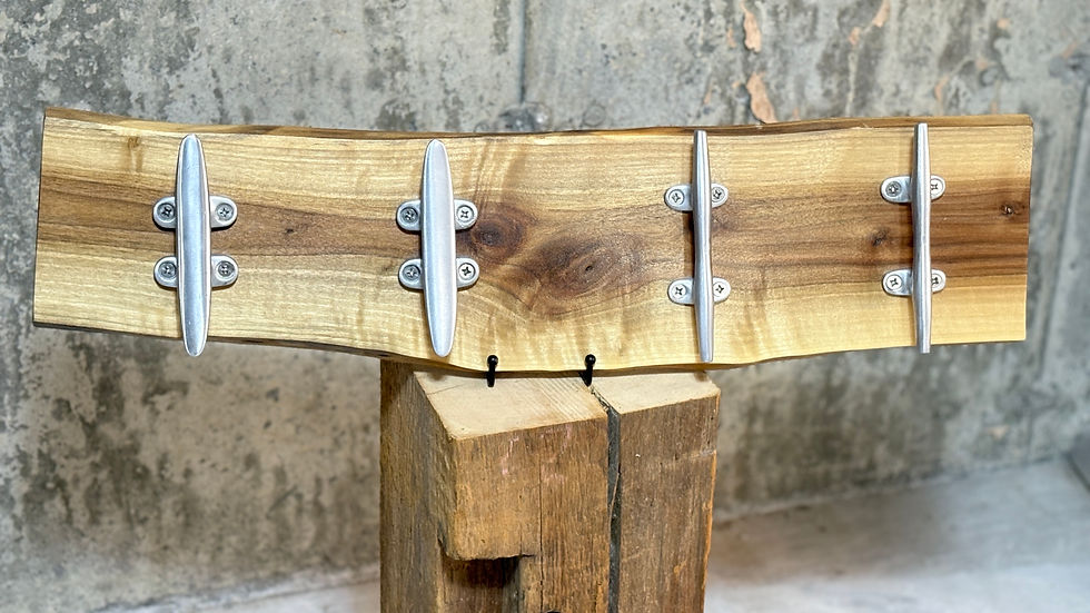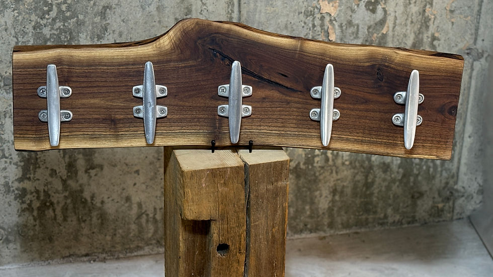 Coat racks can be used to hang coats, jackets and sweaters, sure, but also towels, hats, purses, scarves ... whatever needs hanging. Our coat racks come in a variety of beautiful woods with vintage boat cleats that were rescued from marine salvage yards in Maine. The live edge slabs were sourced from saw mills in Maine and New Hampshire.
